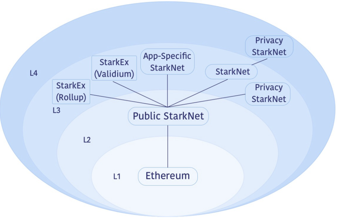 现在有很多大佬已经提出了相关的设计思路,通过 StarkWare 提出的多层网络结构图(Layer3 的其中一种构建思路),我会做进一步的分析和总结,帮助大家理清思路。