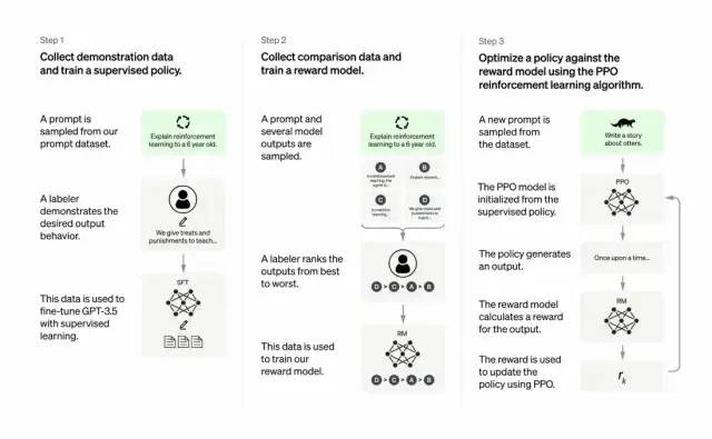 开发人员通过结合监督学习+从人类反馈中获得的强化学习。来提高 GPT-3 的输出质量。在这种学习中,人类对模型的潜在输出进行排序;强化学习算法则对产生类似于高级输出材料的模型进行奖励。