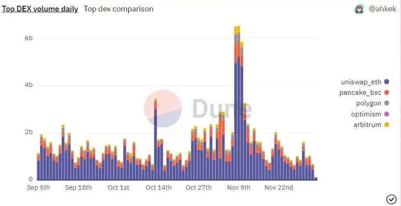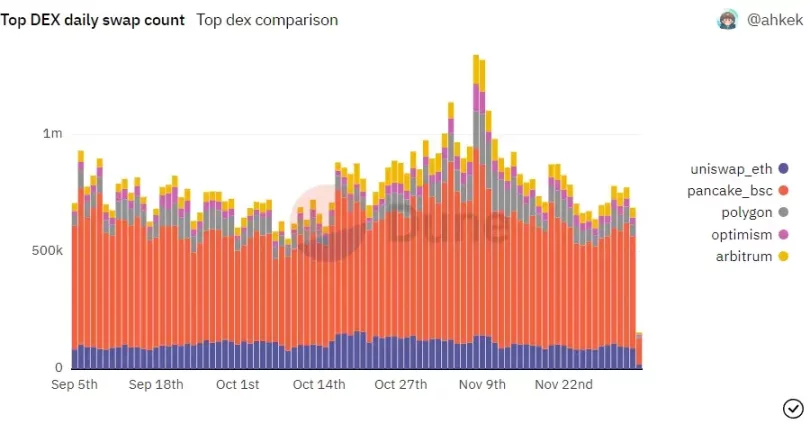 对于 DEX 交易量,我们从 Ethereum、Polygon、BSC、Optimism 和 Arbitrum 中的每个链选择头部 DEX 进行分析。有趣的是,随着 FTX 崩盘开始,我们看到 DEX 交易量在 11 月 6 日左右飙升。除此之外,其它交易日 DEX 的交易量表现相当普通,没有任何重大变化。