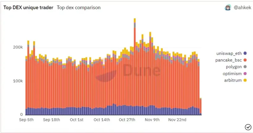 上图显示了头部 DEX 上每日唯一交易者数量。仅从图表中我们就可以看到大多数交易者都在 Pancakeswap 上进行交易。但是,独立用户数在 FTX 事件之后没有明显变化。