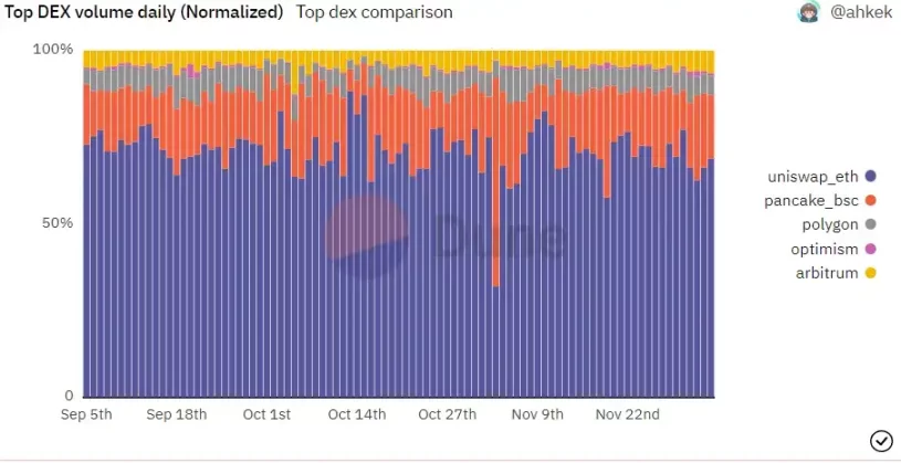 来自以太坊的 Uniswap 占据了大部分市场份额,其次是 BSC 上的 Pancakeswap。