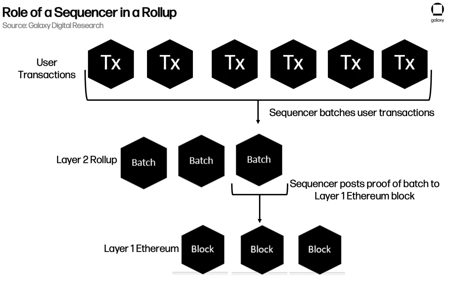 为了提高以太坊的可扩展性,有几个 L2 网络将交易执行从基础层抽象到 rollup。 Rollups 压缩交易数据,使得将一批交易提交到基础层所需的区块空间量明显低于通过链上的内存池单独确认这些交易。 rollups 由被称为 “排序器” 的网络运营商运营,而不是验证者或矿工。排序器负责验证 rollup 的状态转换。它们是将用户交易打包成一个 rollup 批次,然后将这批交易的证明提交给以太坊基础层的实体。下图说明了排序器在 rollup 中的作用: