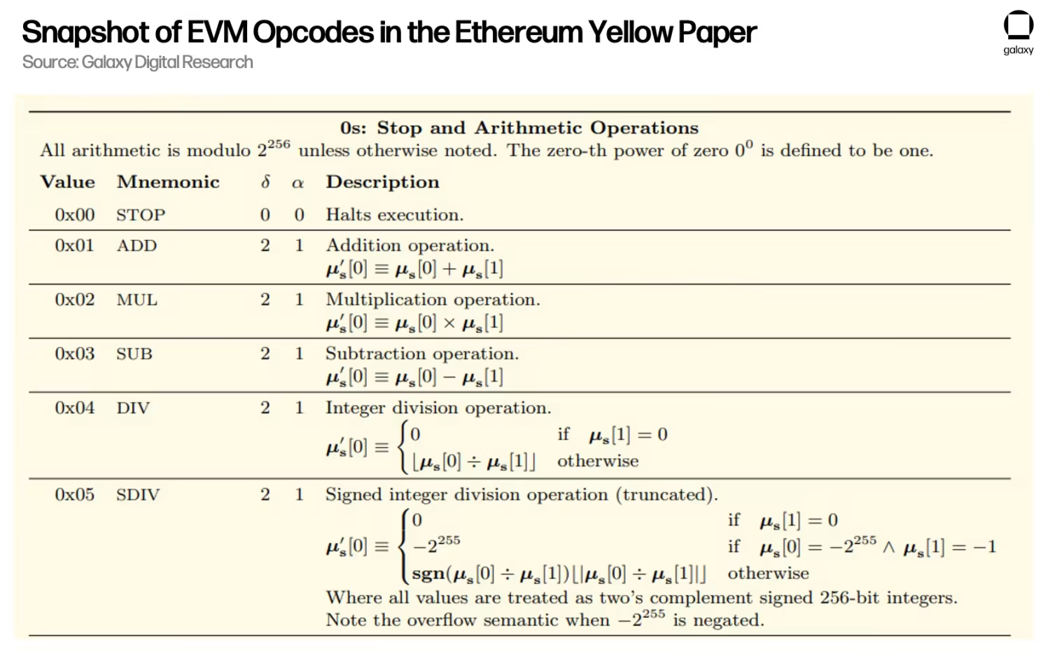 EVM 执行交易的方式有规则。首先,EVM 将人类可读的编程语言(如 Solidity 和 Yul)编译为面向机器或 “低级” 语言,称为 EVM 字节码。然后,EVM 将字节码解析为称为 “操作码” 的顺序指令列表。每个操作码命令 EVM 执行不同的任务,并以十六进制形式在 EVM 字节码中表示。例如,在链上执行智能合约时命令 EVM 保留瞬态数据的操作码以助记符表示为 “MSTORE”,以十六进制形式表示为 “0x52”。为了帮助读者概念化操作码,以下是以太坊黄皮书中定义的简单操作码的快照: