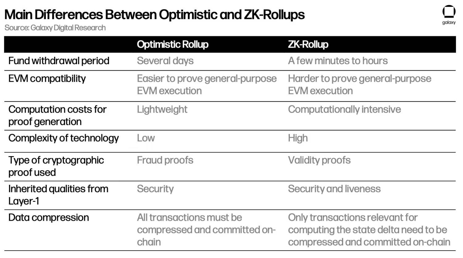 另一方面,ZK rollup 依赖于 ZKP,每次在 L2 上处理交易批次时,ZKP 都会生成有效性证明并发布到以太坊。自动生成所有交易批次的有效性证明,增加了 ZK rollup 的安全保障。这也意味着每次向以太坊提交新的有效性证明时都可以从 ZK rollups 中提取资金,而对于 optimistic rollups 通常有大约 7 天的等待期以允许争议和欺诈证明的生成。 ZK rollups 还提供了比 optimistic rollups 更好的数据压缩。下表总结了 optimistic 和 ZK-rollup 之间的高级差异: