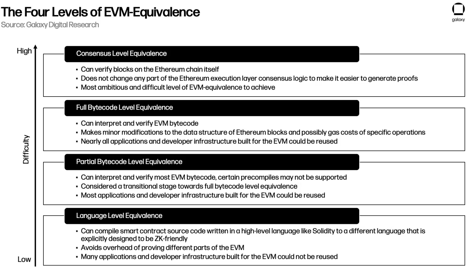 为了实现语言层面的 EVM 等效性,zkEVM 必须能够理解并本地编译 EVM 友好的语言。换句话说,这些类型的 zkEVM 可以将 EVM 友好的编程语言(如 Solidity 或 Yul)翻译成一种为生成 ZKP 而优化的定制语言。这被认为是在 ZK-rollups 中实现 EVM 兼容性的最简单和最有效的方法之一。然而,这些类型的 zkEVM 在为用户和智能合约开发人员提供与 EVM 交互相同的体验方面最受限制。