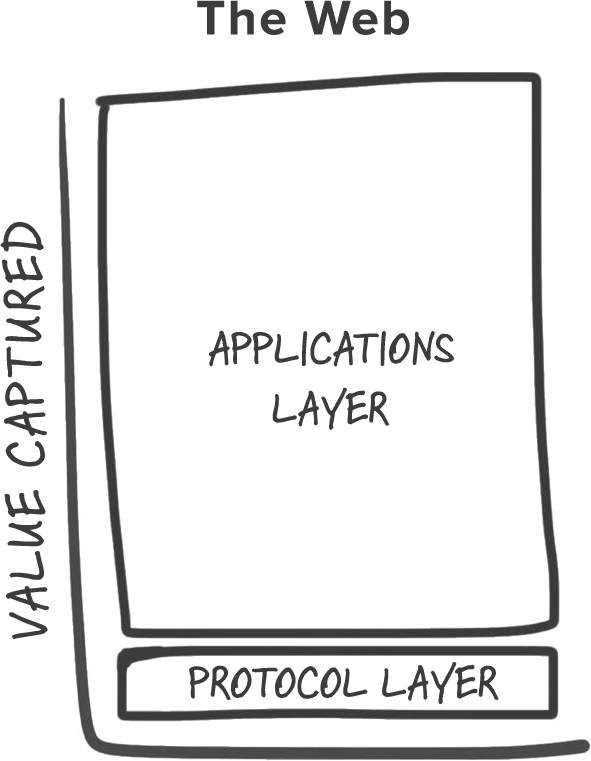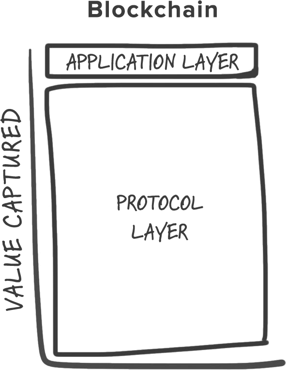 这里有一种思考互联网和区块链之间差异的方式。上一代共享协议(TCP/IP、HTTP、SMTP 等)产生了不可估量的价值,但其中大部分主要是以数据的形式(想想谷歌、Facebook 等)被捕获并在应用层上重新整合。就价值如何分配而言,互联网堆栈是由 “ 瘦 “ 协议和 “ 胖 “ 应用组成的。随着市场的发展,我们了解到,投资于应用产生高回报,而直接投资于协议技术通常产生低回报。