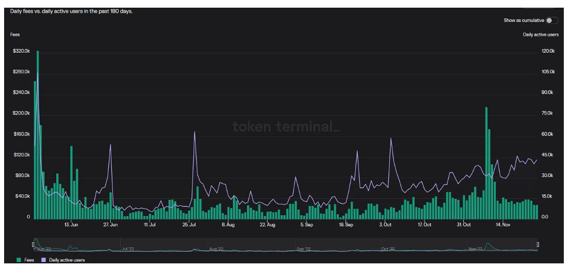 以下是过去 180 天 Optimism 的每日费用(绿色)和每日活跃用户(紫色):