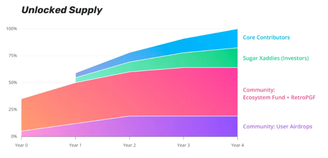 Optimism 的流通代币供应量目前仅为发行时总供应量的 5%(4,294,967,296),并将以每年 2% 的速度增长。以下是解锁时间表: