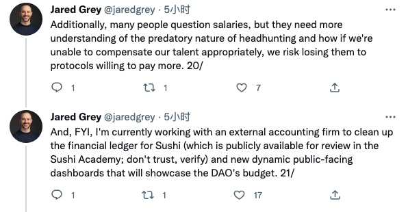 - 关于质疑二,Jared 回应称 Sushi 一直都是猎头的目标,如果 Sushi 不能给予工作者合理的薪酬,很容易遭到竞争对手的挖墙脚。此外,Sushi 正在与一家外部会计公司合作,以整理并公开财务账目。至于为个人牟利一说,Jared 称其在上任 Sushi “主厨” 之时就放弃了合同中的遣散费条款,将原有的 25 万美元离职预算全部捐给了财库。