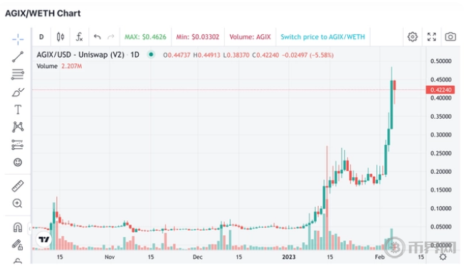 据公开信息,SingularityNET是一个去中心化的人工智能平台和市场,旨在通过AGI技术为不同平台提供AI服务,并在此过程中创造大规模AGI Token使用案例。在各个垂直市场,如DeFi、机器人、生物技术、游戏和媒体、艺术和娱乐、企业级AI等,均可看到SingularityNET的应用。该平台于2021年5月在Cardano网络上启动。AGIX代币最新报价为0.4168美元,日涨幅达30%,距离1月6日0.05美元的价格,已增长8倍。