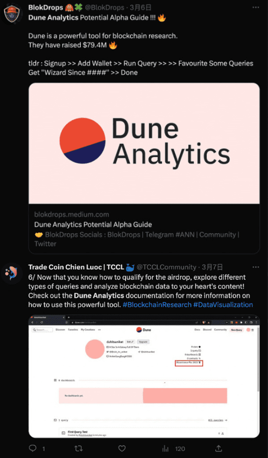 近日,在社群媒体Twitter上疯传链上数据分析平台Dune Analytics将释出代币发行计划和空投的消息,更出现相关教学文章,引发空投猎人的注意、造成大量的无效互动。