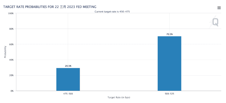 市场主流意见随即转向,根据芝商所FedWatch的资料显示,交易员押注联准会3月更可能升息2码,此机率从听证会前的约30%窜升至超过70%。