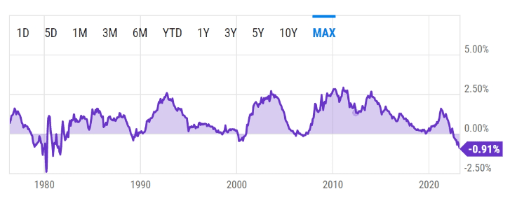 另外值得注意的是,当前2年期与10年期美国公债殖利率的倒挂幅度已高达91个基点,创下自1980年代初以来的最严重状况,甚至远远超过2000年网络泡沫破裂、2008年全球金融危机爆发时的幅度。