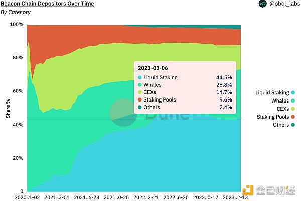 LSD HODLers 是最不可能卖出的:他们的质押已经有了流动性,累积的奖励已经在流动性质押代币的市场价格中得到了体现,并且之前已经从质押的流动性中获益。包括 Coinbase 在内的流动性质押协议,占信标链储户的 44.5%;略低于初始奖励一半的卖压已经减少!