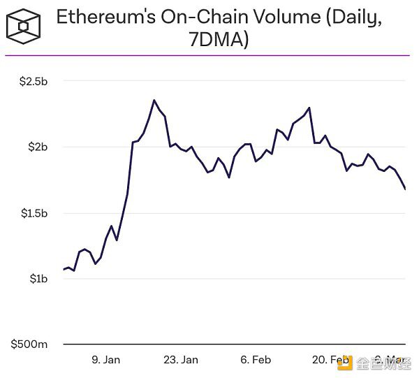 虽然上面的情景设想了 2023 年高点的交易量,但我们也看到 7 DMA 移动平均线交易所和链上 ETH 交易量合计为 24.3 亿美元。