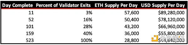 就结构性流量而言,在最初的 27 小时等待期过后 -- 并假设每个验证者有 32 枚 ETH 的余额 -- 在 11 天内,每天将有 5.76 万枚 ETH 被解锁,并在接下来的 41 天内减少到 5.04 万枚 ETH,如果继续发生质押外流,那么在随后的几个月内将继续下降。