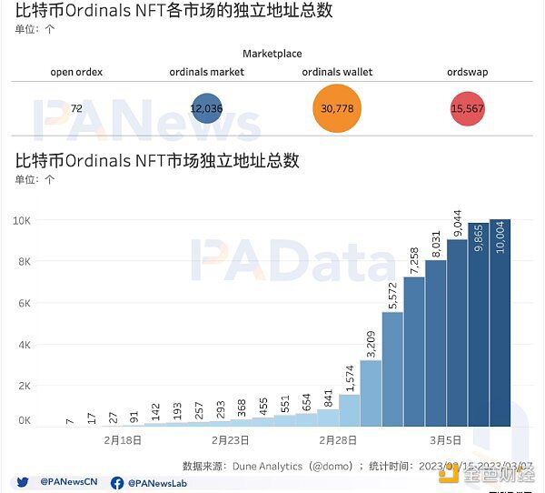 2 )ordinals.market、ORDSWAP、OrdinalsWallet 和 OpenOrdex 四大市场在 2 月 15 日至 3 月 7 日期间的累计交易总额约为 699 万美元,当前总独立地址数突破 1 万个。