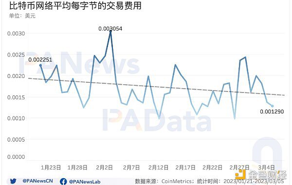 不过,就目前的情况而言,这种影响尚未体现。相反,近期比特币网络平均每字节(最小区块空间单位)的交易费用还呈下降趋势,从 1 月 21 日的 0.0023 BTC 下降至 3 月 5 日的 0.0013 BTC,降幅约为 41.52% 。并且近期平均每字节交易费用的波动也比较大,最高能达到 0.0031 BTC,最低则只有 0.00099 BTC。