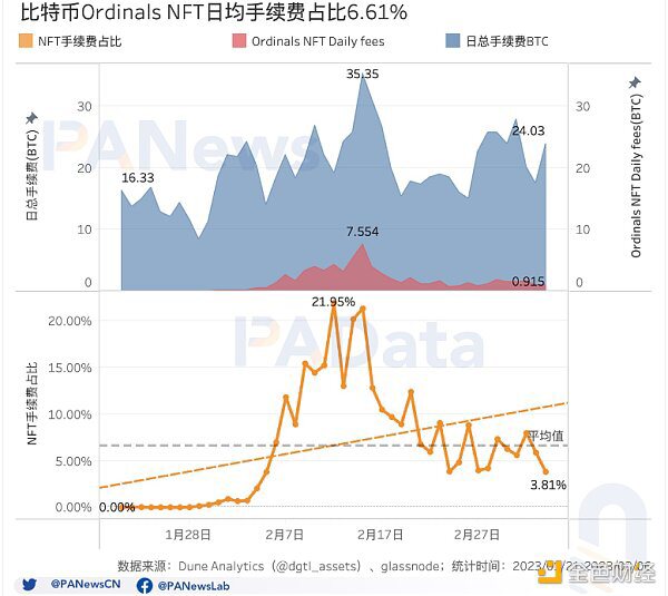 从 OrdinalsNFT 手续费占当日总手续费的比重来看,统计期内的平均值约为 6.61% ,即矿工收入的近 7% 来自 NFT 活动。不过这只是日均值,受到早期 NFT 活动较少的影响较大,如果把观察的时间范围缩小至 2 月份,那么矿工收入的近 9% 都来自 NFT 活动。