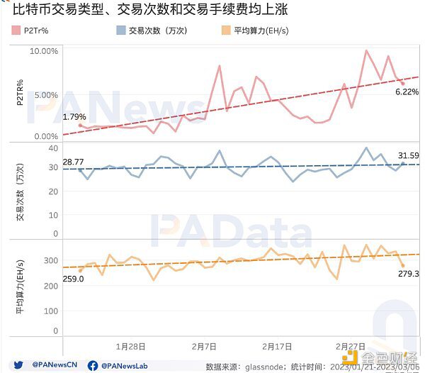 根据 glassnode 的分类,比特币使用余额的类型,即可理解为交易类型,一共可以分为 8 种,包括P2P K、P2P KH、Bare Multisig、P 2 SH、P 2 WPKH、P 2 WSH、P 2 TR 和 Non-standard。其中,P 2 TR 指 Pay to Taproot,即使用 Taproot 交易,这种交易类型的占比在 1 月 21 日以后呈现显著上升趋势,从 1.79% 上涨至了 6.22% ,最高一度接近 10% ,近期则基本保持在 5% 以上。