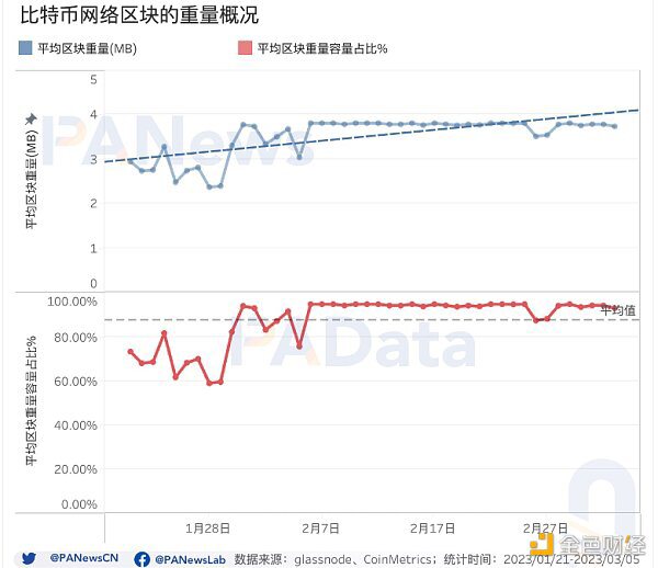 这与比特币 OrdinalsNFT 使用的区块空间大小有关。尽管近期受到 NFT 活动的影响,比特币的平均区块容量呈明显的上升趋势,从 1 月 21 日的 2.94 MB 上涨至 3 月 5 日的 3.74 MB,涨幅约为 26.94% 。自 2 月份以来,平均区块重量基本保持在 3.8 MB 左右。