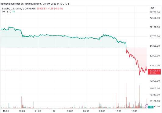 作为回应,小型加密银行的股票大幅下跌。截至收盘,Signature Bank 下跌约 12%,而 Silicon Valley Bank 当天下跌约 60%。