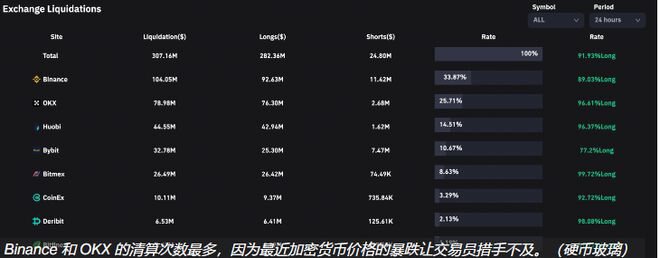 根据 Coinglass的数据,全球交易量最大的加密货币交易所 Binance 的交易员损失了 1.04 亿美元,在交易所中损失最大,其次是 OKX 损失 7900 万美元,火币损失 4500万美元。