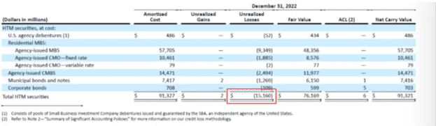 在 2020 年至 2021 年,美联储还是将利率保持在接近于零的水平,因此硅谷银行持有 AFS 和 HTM 资产的平均收益率非常之低。伴随着美联储 2022 年以来的快速加息,这些低利率债券价格暴跌,持有大量此类债券的银行资产端开始涌现出巨大的未实现损失:HTM 的未实现损失就高达逾 150 亿美元。