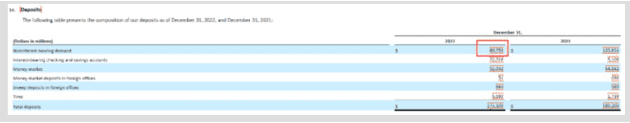年报显示,2022 年,硅谷银行的无息存款由 2021 年的 1258 亿骤降至了 807 亿。