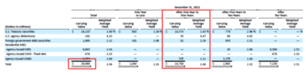 硅谷银行的最新年报显示,其投资组合中超过一半都是 1 年期到 5 年期的无风险国债。现在看来,该行对这类固定收益资产的高配置比例几乎已经超过了安全警戒线。