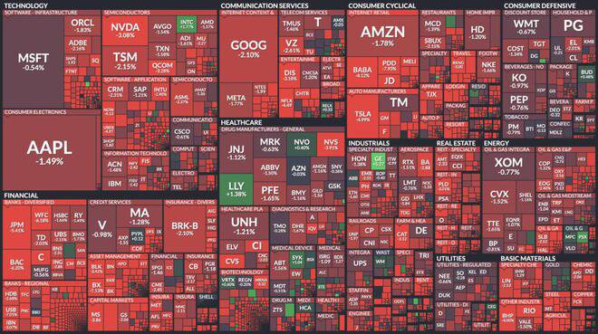 那斯达克指数下跌237.65 点,或2.05%,收11,338.35 点。