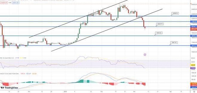 在技术方面,BTC / USD 货币对以强烈的抛售倾向交易,已经破坏了 20,350 美元的双底支撑位。