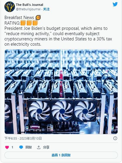 该报披露,根据拜登旨在“减少挖矿活动”的预算提案,美国加密货币矿工可能面临 30% 的电力成本税。