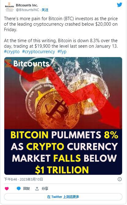 由于比特币价格大幅下跌,全球加密货币市值再次跌破1万亿美元。