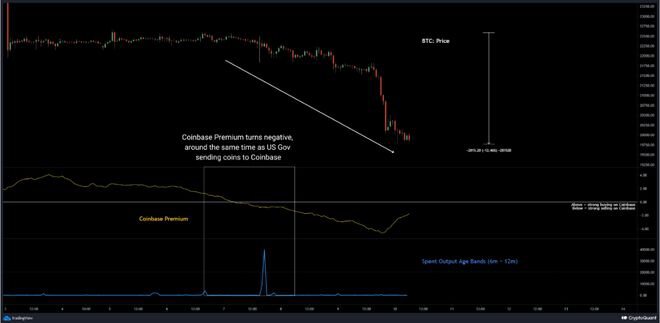 正如一位分析师在 CryptoQuant帖子中指出的那样,美国政府最近的举动可能对 BTC 价格的最新下跌起到了一定作用。这里有几个相关指标:Coinbase Premium 和 Spent Output Age Bands (SOAB)。