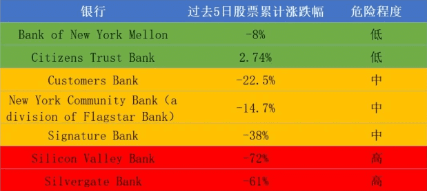 虽然我们目前无法100%确定其它银行是否安全,但从股票信息中可以获取一点信息,可以看出,除了SVB和Silvergate以外,Signatures Bank等三家银行同样不能让我们放心。