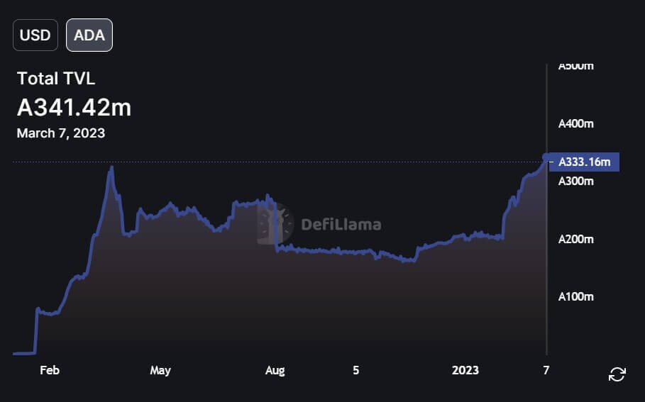 根据 DeFillama 数据,3 月 7 日,以 ADA 代币计算,Cardano 上锁定的资产总值 (TVL) 达到 3.4142 亿美元的历史新高。