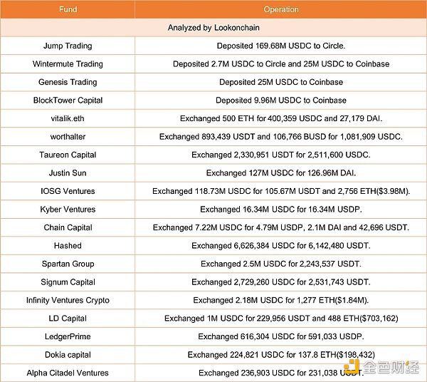另一方面,孙宇晨、Kyber Ventures、Chain Capital、Hashed、Spartan Group、Signum Capital、Infinity Ventures Crypto、LD Capital、LedgerPrime、Dokia capital 和 Alpha Citadel Ventures 则将 USDC 兑换成了 DAI、USDT、USDP、BUSD 和 ETH 等其他加密货币尝试套利。