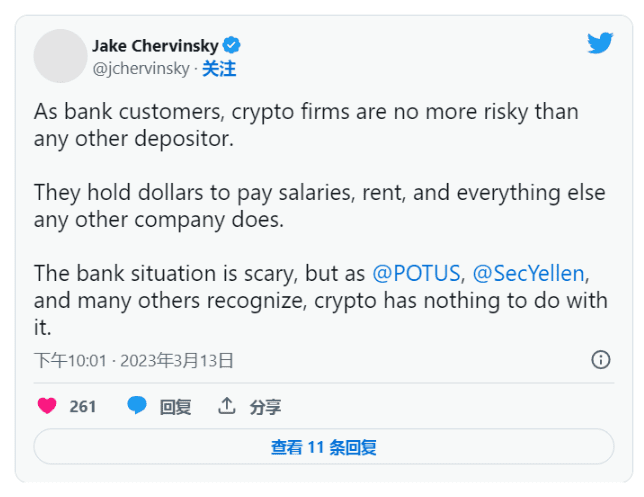 为了消除对加密货币在当前影响美国几家金融巨头的危机中的作用的任何误解,Chervinsky 表示,加密货币公司受到的影响与其他机构客户一样多。