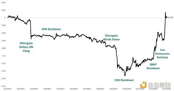 图1:银行关闭时间表和加密货币总市值(来源:CoinMetrics、Grayscale Research,东部时间2023年3月1日 – 13日下午2时)