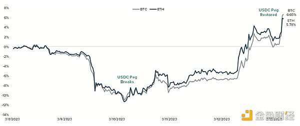 在近期事件中,USDC并不是唯一一个贬值的稳定币。稳定币——除了Tether和TrueUSD——暂时失去了它们的美元挂钩。当波动性超过流动性时,稳定币的挂钩可能会被打破,这通常是因为对支持该代币的储备缺乏信任。从USDC脱钩到后来恢复挂钩的这段时间,比特币和以太坊都表现出了持续的上升趋势,表明投资者正在使用稳定币购买这些数字资产。