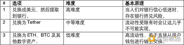 (2)鉴于Tether迄今为止的稳定表现,选项2的表观风险较低,但有限的流动性可能使之几乎不可能实现,而且涉及将交易对手风险转移到一家不透明的海外机构。