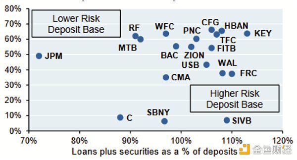 硅谷银行(SVB)是为科技和风险投资行业提供银行服务的旗舰提供商,是下一个陷入困境的银行。在宣布出售22.5亿美元的股票进行筹资后,硅谷银行遭遇了超过420亿美元的挤兑。由于该银行开发了一个迎合初创公司的利基市场,存款主要来源为风险资本支持的公司,而非传统的小额存款。SVB的贷存比也很高(见图3),只有少量粘性较强的小额存款,使其在利率上升、存款外流和强制出售资产(所有这些最近都有发生)的情况下面临潜在的资本短缺风险。