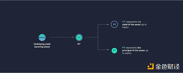 首先,Pendle 将产生收益的代币打包成 SY(标准化收益代币),然后 SY 被分成本金和收益两部分,分别是 PT(本金代币)和 YT(收益代币),它们分别可以通过定制的 V2 AMM 进行交易。