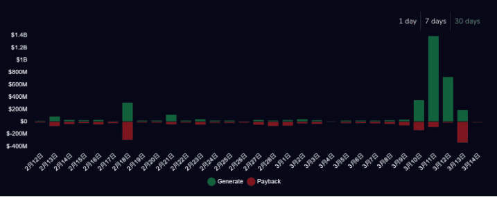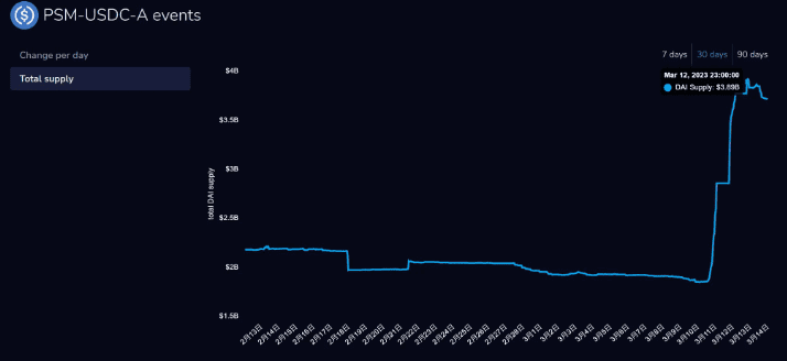 在3月11日第二大美元稳定币USDC发行商Circle,宣布在硅谷银行仍有33亿美元的风险部位,接着大量的USDC通过PSM进入Makerdao铸造DAI,其中看到PSM-USDC中DAI的供应量在三天内突增超过2倍,从低点的18亿美金暴增至38亿美金。