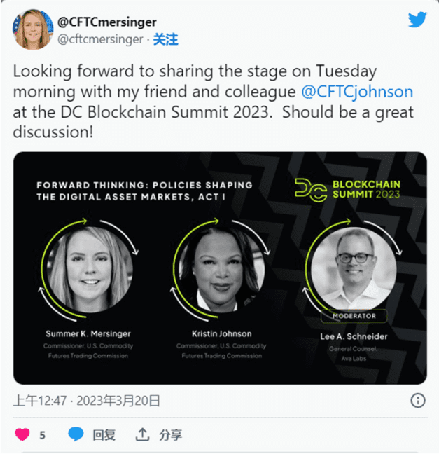 · CFTC 委员 Summer Mersinger 在 DC 区块链峰会的炉边谈话中表示,国会必须团结加密货币监管机构。