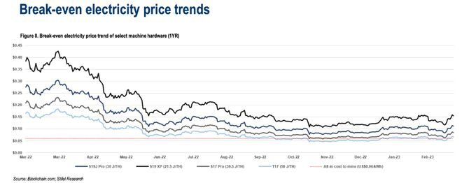 不过随着比特币价格的飙升,美国投行Stifel 周一在一份分析报告中表示「今年的第一季度将成为一个更好的季度」。根据下图,同样单位的每秒算力下消耗50 瓦电力设备的盈亏平衡电价,一直在一度电0.06 美元左右。