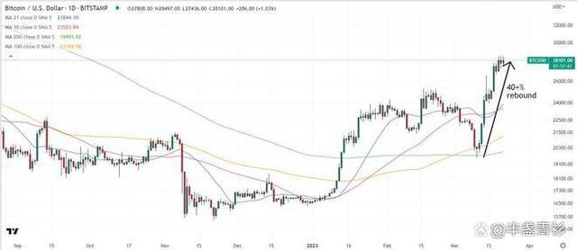 比特币最后一次易手略高于 28,000 美元,较早前月度低点 20,000 美元上涨超过 40%。