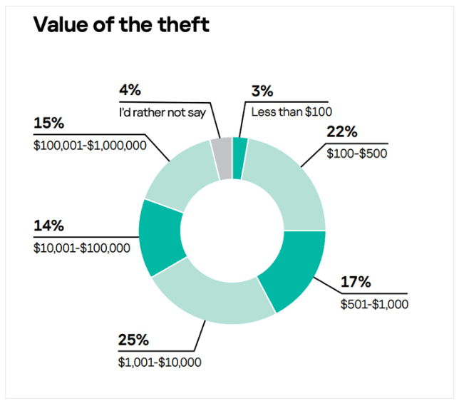 盗窃的平均价值为 97,583 美元,但 15% 的受访者丢失的加密货币价值在 100,001 美元到 100 万美元之间。