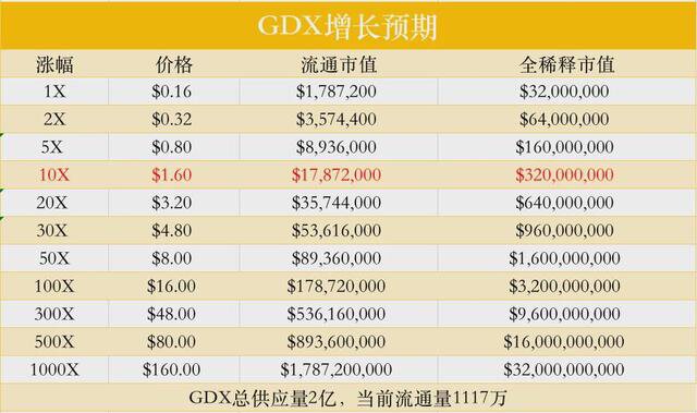 如果 Gridex 能够实现自己的多链梦想,则有望蚕食 Uniswap 目前的市场,成为第一梯队玩家。按照与 UNI 流通市值相等计算,GDX 还有 333 倍上涨空间,目标价格 466 美元;如果按照与 UNI FDV 相等计算,GDX 还有 23 倍的上涨空间,即目标价格是 33 美元。对于未来 GDX 的增长预期,我们也做了一张图,如下所示:
